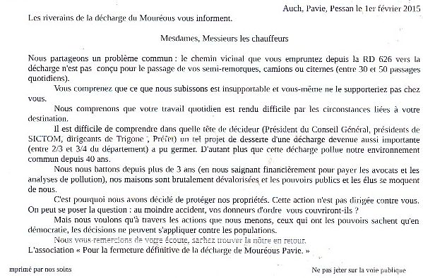 contre Trigone, auprès du Procureur d'Auch pour pollution des eaux par négligeance.